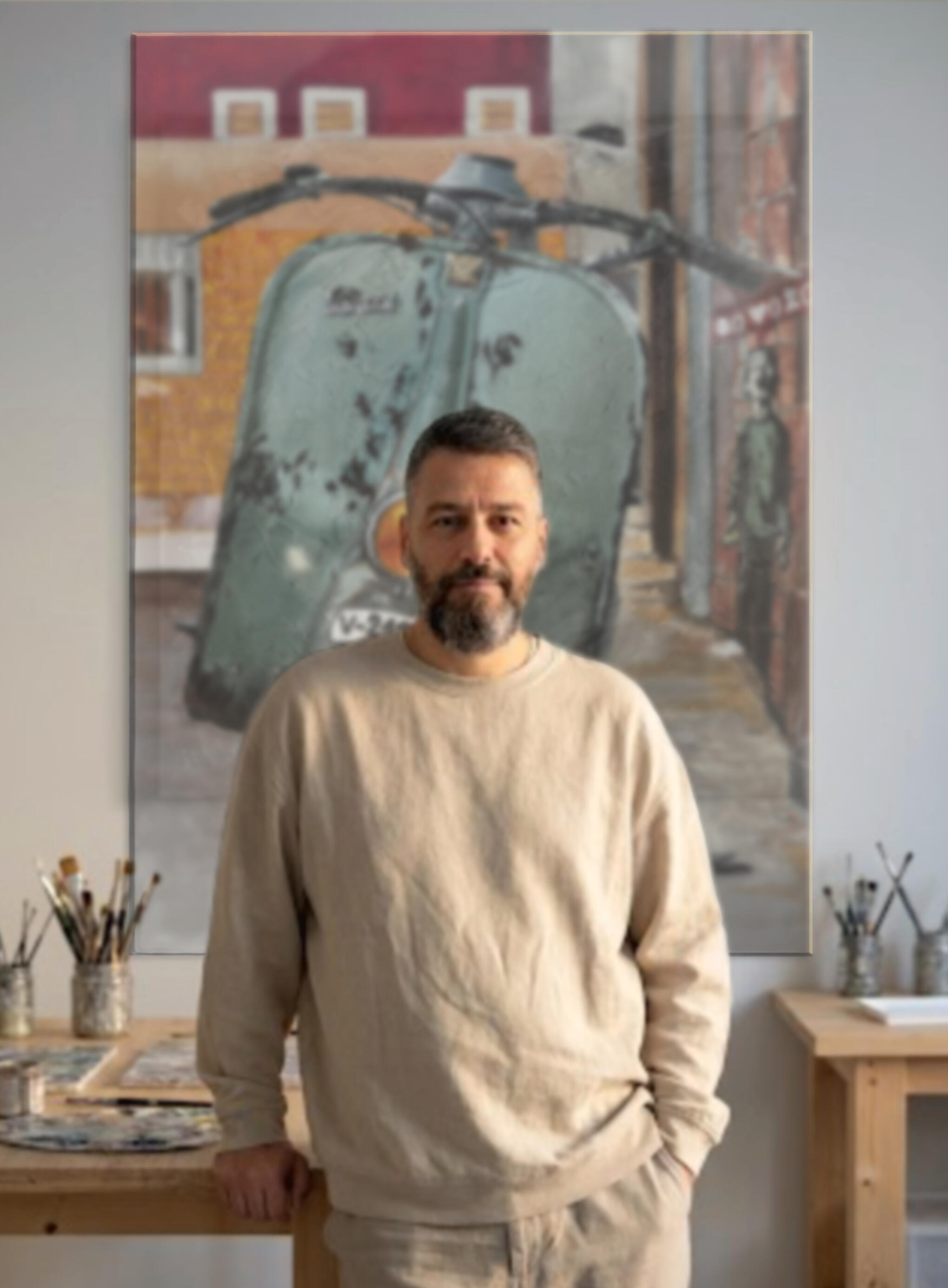 Vengo del mundo real, de talleres, de trabajar y de mirar vehículos durante años. Aprendí a fijarme en sus luces, sus brillos, formas y detalles que dicen más que cualquier explicación.Pinto como aprendí a pintar: lápiz y papel, con técnicas tradicionales. Acrílico, óleo, papeles, lienzo… esa base nunca se pierde. Soy muy friki de la tecnología, y cuando una obra me lo pide, la trabajo en digital con el mismo proceso que usaría en físico: encaje, claro-oscuro, perspectiva, capas, teoría del color, paciencia y corrección constante.